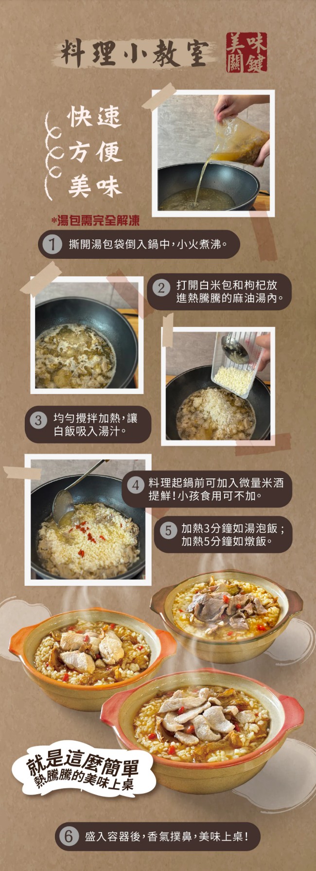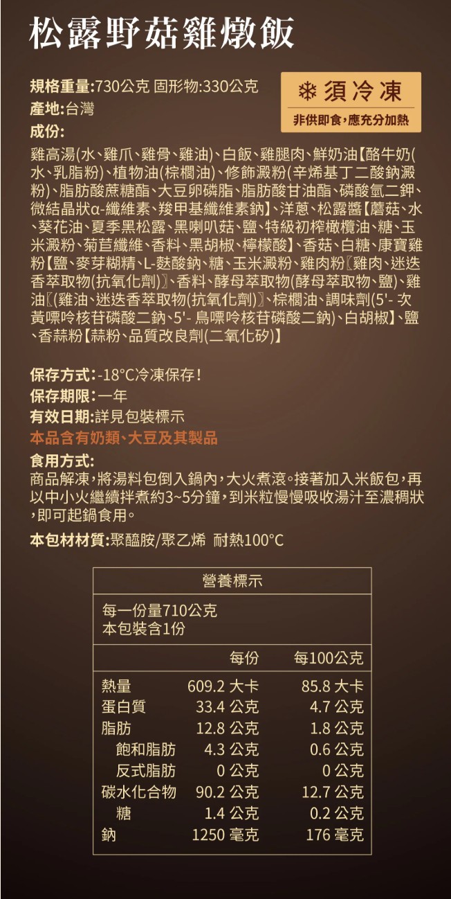 ▲麻油雞、麻油豬、麻油羊肉 燉飯▲松露野菇雞燉飯【◆麻油燉飯_雞/豬/羊系列】麻油香氣與十足的料量,搭配枸杞的鮮甜!只要簡單的加熱,暖胃暖心,隨時都能吃到奢華的麻油燉飯!【◆松露野菇雞燉飯】頂級氣冷雞搭配新鮮野菇與松露結合,烹調成一道口感濃郁、香氣撲鼻的美味料理。推薦晚餐,宵夜,露營,送禮~